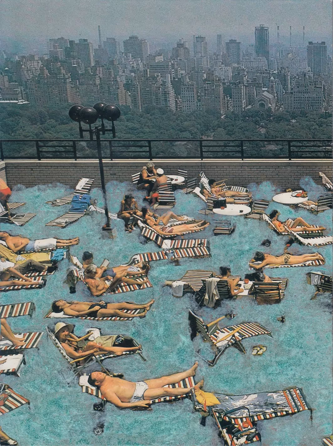 In „Betonpause“ begegnen wir einer surreal anmutenden Szene: Sonnenanbeter:innen auf einem Dach über der Metropole, scheinbar schwerelos treibend – nicht im Wasser, sondern auf hartem Boden. Die eingefärbte Fotografie spielt mit Realität und Inszenierung, mit Erholung und Enge, mit dem Wunsch nach Natur inmitten urbaner Verdichtung. Die Stadt wird zur Bühne einer kollektiven Illusion von Sommer.