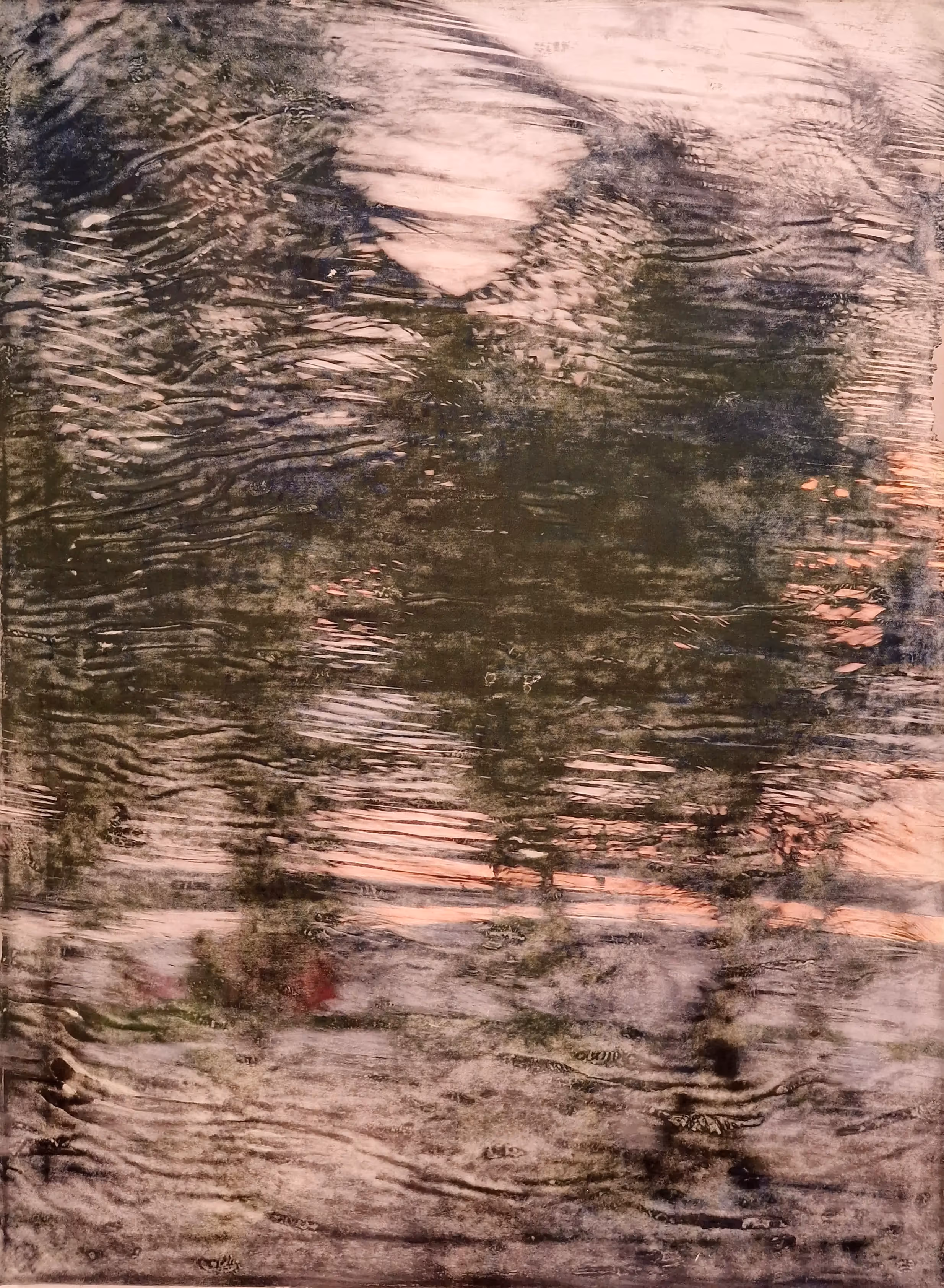 In ihrer Werkserie „Palmenrauschen“ entführt Julia Strankmann die Betrachtenden in eine Welt zwischen Tropenidylle und innerem Erleben. Die großen Bilder spielen mit Unschärfen, Überlagerungen und flirrenden Strukturen, die an Palmwedel im Wind erinnern. Zarte Rosa- und Grüntöne treffen auf dunkle Bewegungsakzente – wie ein Moment, der sich dem klaren Blick entzieht und doch tief im Gefühl verankert bleibt.