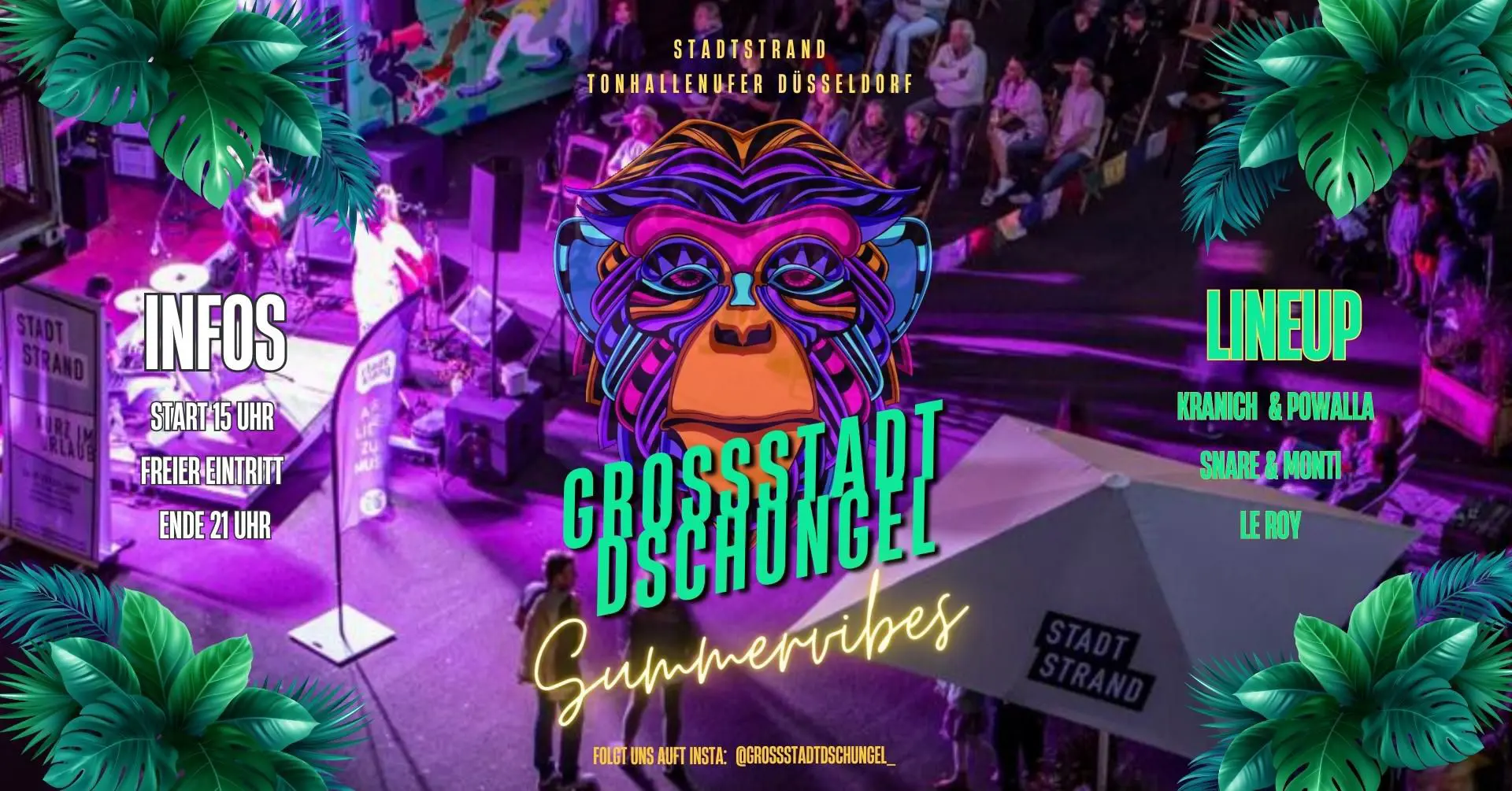 DER GROSSSTADTDSCHUNGEL präsentiert seine Summer Vibes Edition und verwandelt dabei den Stadtstrand am Tonhallenufer in einen tropenartigen Regenwald ohne Regen. Entspannte Beats zum Wochenendausklang von den DJs Kranich & Powalla, LeRoy und Snare & Monti.
